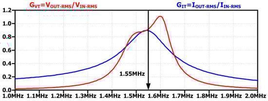 The simulation results for the voltage and currents gains of the CPT system are shown in Figure 7. The magnitudes obtained are 0.93 and 0.91 for |GVT| and |GIT|, respectively, so it can be observed that the integration of the parasitic resistance has an impact on the gain results, although not significantly.