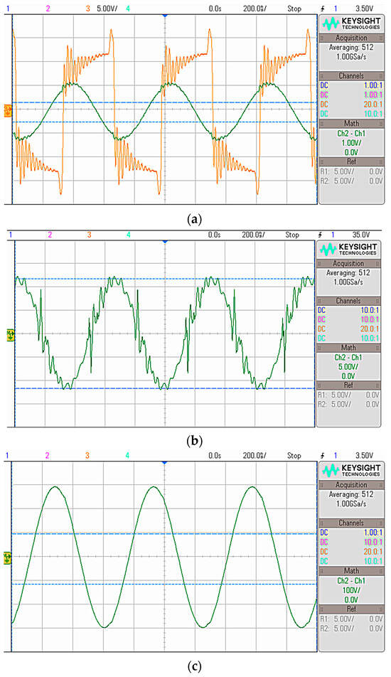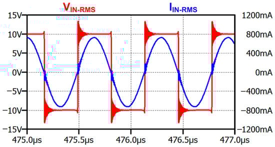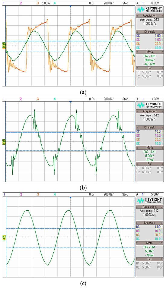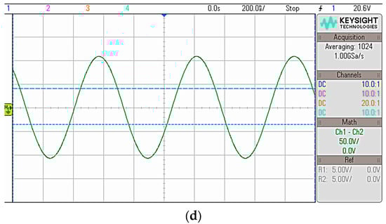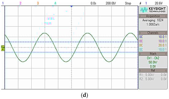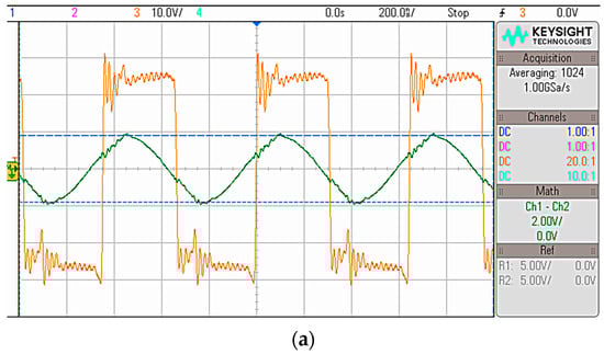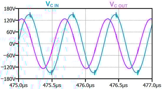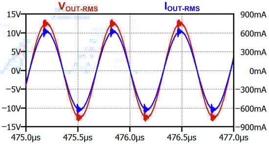 Waveforms for VIN-RMS and IIN-RMS are shown in Figure 12a (the IIN-RMS waveform is obtained by using a 1 Ω resistor in series with the LIN inductor). The measured phase shift value is approximately 19°, which indicates that the circuit operates close to resonance. A waveform for VOUT-RMS is shown in Figure 12b, and it can be seen that the waveform is close to a sine wave. Waveforms for the voltages in the CIN and COUT capacitors are shown in Figure 12c,d, respectively.