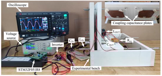 Once the methodology has been verified in simulation, an experimental prototype is performed. An STM32F051R8 microcontroller is used to generate the inverter switching signals, as well as two LMG5200 modules, which are gallium nitride half-bridge inverters. The inductors are produced using 25 mm diameter PVC pipes and AWG 20 magnet wire. For the design of the coupling capacitors, two pairs of 10.3 cm × 10.3 cm copper plates with a thickness of approximately 1.3 mm are used, separated at a distance of approximately 1 mm. The copper plates are placed in a structure whose design allows for distance adjustment between them to validate the operation of the CPT system with changes in the value of the coupling capacitor. Figure 11 shows the prototype used.