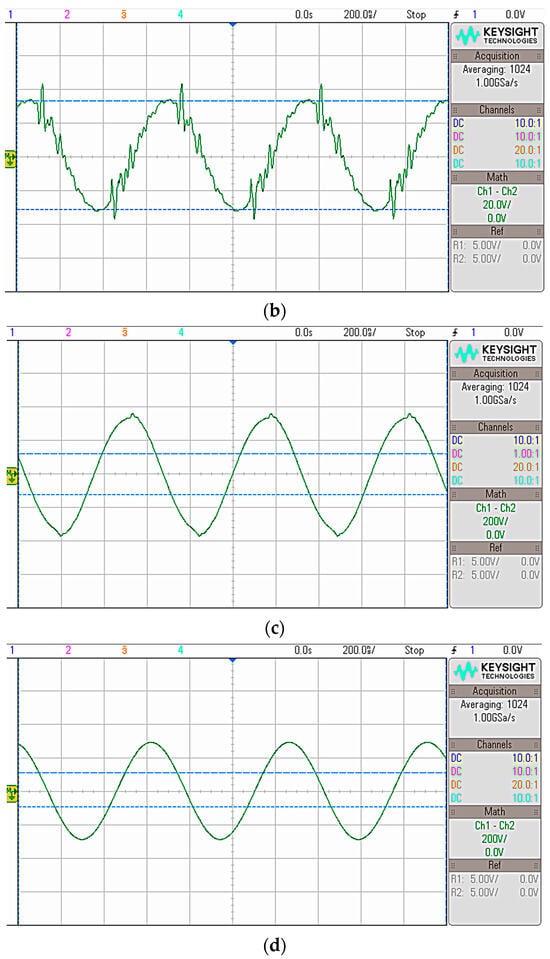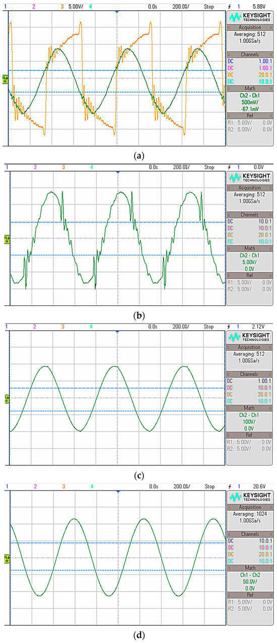 Waveforms of experimental results for = 25 W: (a) VIN-RMS (yellow trace) and IIN-RMS (green trace), (b) VOUT-RMS, (c) , and (d) .