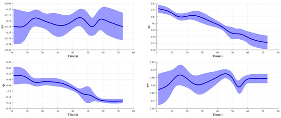 The results indicate that the variance (the width of the blue band) becomes progressively smaller as we approach the valve, indicating that the constraints become progressively stronger due to the same target position and orientation for each demonstration. The trajectory variance is larger in the initial stage due to the disturbance caused by the current to the ROV, which makes the initial position and orientation different. The dark blue curve in the figure indicates the trajectory with typical characteristics obtained after GMM–GMR preprocessing, which contains the trajectory characteristics of underwater intervention.