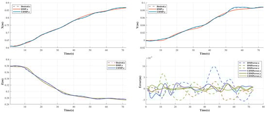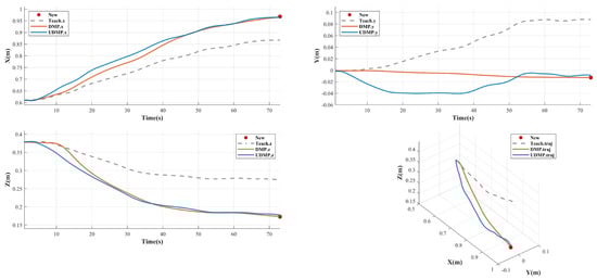 Figure 12. The trajectories obtained from the generalization of both methods converge to the desired new target position, and the generalization result of the proposed UDMP method is similar to the shape of the demonstration trajectory, i.e., the constraints in the motion process guarantee the phase, while the DMP method is different from the shape of the demonstration trajectory. Although all of them eventually converge to the target position, the learning of the shape of the trajectory is the focus of this paper’s research, so the above results show that the UDMP method proposed in this paper is effective for the application of underwater intervention demonstration learning.