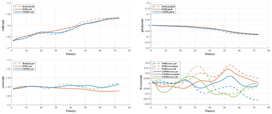 Table 3. From the results, it can be observed that the errors of both methods tend to be zero, but compared to the DMP method, UDMP learns better for the features of underwater interventions, especially in the orientation dimension, and UDMP can learn better from the demonstrative data which has little change in orientation.