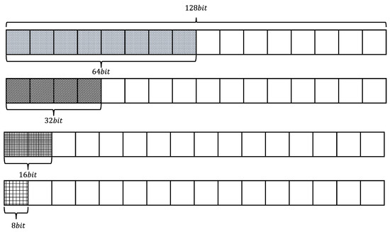 The general-purpose registers can also function as 32-bit registers, denoted as w0 to w30. Vector registers are capable of parallel operations, allowing values stored within them to be processed in different unit sizes. Specifically, these units include byte (8-bit), half-word (16-bit), single-word (32-bit), and double-word (64-bit) divisions, as illustrated in Figure 1. Table 2 details the arrangement specifier combinations used when applying vector instructions. Vector instructions, often referred to as NEON, enable parallel computations using the vector registers.