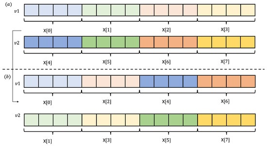 To implement the NTT and inverse NTT operations in parallel, masking must be applied to the 32-bit values used in the multiplication operation. Masking is achieved through a data reordering technique. In order to optimize the parallel implementation of operations using the same zeta value, data reordering was used for some operations. Figure 2 illustrates part of this data reordering process. The top two data values represent the state before register realignment, while the bottom two images show the state after register realignment. The task of rearranging the upper two register arrays to match the lower two arrays was efficiently accomplished using the ZIP1, ZIP2, and TRN1 instructions.