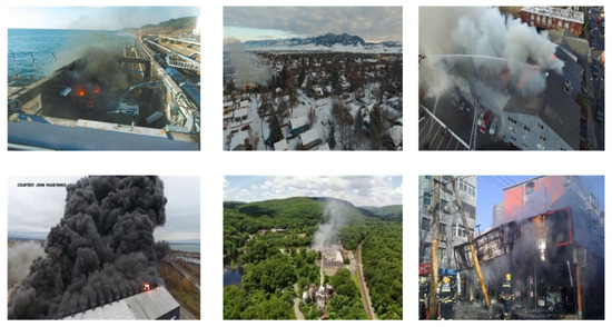 The datasets used in this paper consist of two main parts, as shown in Table 1. The first part includes 6863 fire smoke images and 2418 non-smoke images obtained via the Internet. It contains different types of fire smoke scenarios including towns, factories, and forests, indoors and outdoors. The latter part comprises a collection of public datasets extensively utilized in the relevant literature, including the following: (1) the CVPR Lab-KMU Fire and Smoke Database; (2) the Smoke dataset sourced from the State Key Laboratory of Fire Science, University of Science and Technology of China. The typical samples of the datasets are shown in Figure 1.