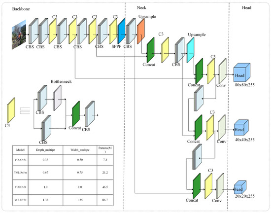 The latest YOLOv5 version 7.0 is used in this paper. The network structure is shown in Figure 3. There are three main components of the network structure: head structure, neck structure, and backbone network. Features are extracted and the feature map undergoes progressive reduction through the backbone network. The main structure contains a ConvBNSiLU(CBS) down-sampling processing module, a C3 module, and Spatial Pyramid Pooling-Fast (SPPF) module. The neck utilizes the Feature Pyramid Network (FPN) to merge shallow graphical features with deeper semantic features, aiming to acquire more comprehensive features. The head layer functions as the detect module and comprises three convolutions corresponding to three feature detection layers, facilitating upscaling or downscaling as needed.