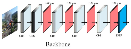To enhance smoke detection accuracy, this paper substitutes the C3 module in the backbone network with the SAConv module. This change boosts the network’s ability to extract smoke features while minimizing redundancy in the extracted data, enabling deeper feature extraction without increasing inference time. Figure 5 illustrates the layout of the DCNFYOLO backbone network, where the first two CBS modules are designed to reduce the input image size while increasing the number of image channels. The SAConv module consists of three main components: two global context modules and one SAC component. The network structure is illustrated in Figure 6. The smoke dataset is output by the CBS module and transferred to the SAC network for further feature extraction. SAConv can convolve the same input features with different Atrous rates and collect the results using a switching function. The switching function is spatially correlated, and each position of the feature map can be controlled by a different switch to control the output of the SAC, thus enhancing the feature extraction of the neural network on the smoke dataset. This converts the convolutional layer to SAC, as shown in Equation (1).
