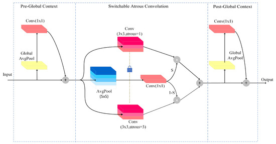 where x and y are the input and output of the switchable atrous convolution, and r is a hyperparameter of the SAC representing the atrous rate, w represents the weights, and Conv(x, w, r) denotes the convolution operation. The switch function S ( x ) is an average pooling layer of 5 × 5 kernels followed by the 1 × 1 convolutional layer. The insertion of a lightweight global context module before and after the main component SAC makes the judgment of the switching function S ( x ) more stable.