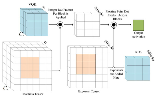 The specific data path is shown in Figure 10. Initially, each block of the VQK and mantissa tensor undergoes dot product operations, yielding individual values. All computations are executed using low-bit fixed-point operations, significantly reducing processing time. Following block multiplication, a tensor of the same size as the exponential tensor and KDS is derived. Subsequently, the exponent tensor is integrated with the KDS tensor by adding their respective values, resulting in a tensor of floating-point numbers. Finally, this tensor is multiplied with the outcome of the VQK and KDS product to generate a floating-point number as the output activation. Throughout this process, inference remains highly parallelizable, akin to standard convolution, where the majority of multiplications are performed using integer rather than floating-point arithmetic. This optimization conserves energy, bandwidth, and computation time.