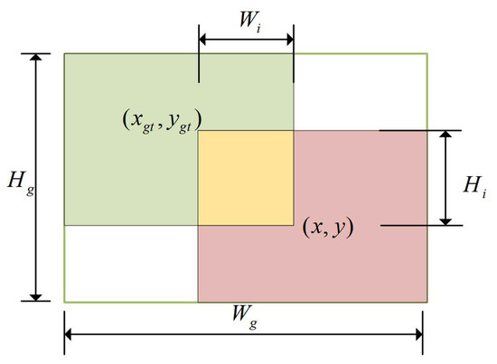 The minimum bounding box formed by the real and predicted boxes is shown in Figure 11. The area calculation of the green boundary box and red boundary box splicing set is shown in Equation (3). The IoU is computed as illustrated in Equation (4).