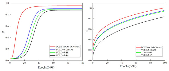 This experiment uses P (Precision), A P (Average Precision), R (Recall), and FPS (Frames per Second) to estimate the prediction results of the model. Furthermore, this investigation employs the size of the model FLOPs to evaluate its performance. FLOPs represent the quantity of floating-point operations utilized to compute the model complexity. The expressions of P, R, and A P are derived as the following Equations (9), (10), and (11), respectively.