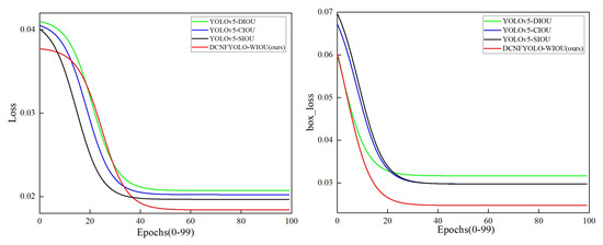 To validate the selection of the WIoU, this study evaluates the performance of different loss functions, including SIoU, DIoU, and WIoU. The comparison is made with the YOLOv5 CIoU loss function. Based on the analysis of Figure 13 and Table 3, the selected loss function in this research shows notable improvements in Box_loss, overall Loss, and A P metrics compared to other alternatives. Specifically, both Box_loss and overall loss are reduced by 0.5% and 0.184%, respectively, while A P sees a notable improvement of 0.9% when compared to the CIoU loss function utilized in YOLOv5.