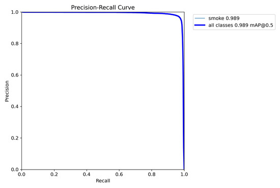 The P-R curve, as shown in Figure 14, has the recall rate on the horizontal axis and the precision on the vertical axis. The closer the curve is to the top right corner, the better the overall performance of the model. According to the P-R curve, the smoke detection method proposed in this paper has high accuracy.