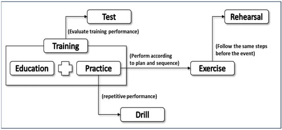 “Education” is the activity of teaching knowledge and skills, focusing on teaching and learning. “Training” is the activity of learning and mastering new knowledge or skills learned through education, and it is executed and practiced through ‘Execution/Practice’ to master knowledge and skills. In addition, it is necessary to perform it repeatedly through “Drill” to effectively master it. “Exercise” is the process of reacquainting and practicing mastered knowledge and skills. “Rehearsal” is a comprehensive set of exercises that are performed in the exact same order before an event. As an activity to evaluate learning and mastery, “Test” is used to measure the level of mastery of knowledge and skills, identify deficiencies, and perform the drill again. The relationship between practice and training is summarized in Figure 1.