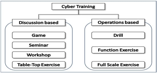 Types and methods of cyber training are divided into discussion-based and operation-based, as shown in Figure 2. Discussion-based cyber training focuses on procedural issues and improvements rather than seeking technical solutions in a simulation environment because participants discuss effective response procedures for a given situation without constructing equipment or other resources. On the other hand, operation-based cyber training focuses on effective activities and actions through improving, measuring, and training cyber capabilities in a realistic training environment by constructing a virtual or secure network [10]. Each cyber training does not have a hierarchical relationship, and two or more types of cyber training are sometimes integrated to achieve the training purpose.