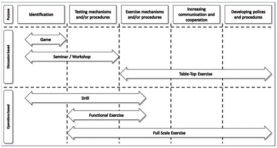 “Seminar” is an informal discussion that provides an overview of new or updated plans, policies, procedures, protocols, resources, authorities, concepts, and ideas. “Game” is played by two or more teams that make decisions and take actions in a hypothetical situation. The outcomes of player actions can be predetermined or dynamically determined. They are useful for validating procedures or assessing resource requirements. “Workshops” are similar to seminars but with increased interaction between participants and a focus on training outcomes. To be effective, they should always have clearly defined objectives, focus on specific issues, and involve relevant stakeholders. “Table-Top Exercise” is a discussion-based session where team members meet in an informal classroom setting to discuss their roles during an emergency and their responses to a particular emergency situation. A facilitator guides participants through a discussion of one or more scenarios. “Drill” is most effective when regularly repeated because they are used to reinforce practice. The procedures being reinforced should already be validated and approved, and organizational-level awareness should be established. They are typically used to learn new equipment, validate procedures, or practice skills. “Functional Exercise” is designed to validate and assess the coordination, command, and control capabilities of personnel. Exercise scenarios are typically conducted in a realistic, real-time environment that simulates the movement of personnel and equipment. Exercise control uses a situation list to ensure that activities remain within predefined bounds and objectives are met. Simulators inject scenario elements to simulate real-world events and are used to enhance current capabilities and achieve high adaptability. “Full-Scale Exercise” is the most complex type of exercise and is multi-agency, multi-jurisdictional, and multi-disciplinary exercises that aim to validate multiple aspects of preparedness. Activities in exercise scenarios are driven by operational-level, real-time event updates that attempt to reconstruct the stress environment of a real-world event. Personnel and resources are realistically mobilized, and the problems are realistic and require critical thinking and quick and effective responses. Situations and events that may occur between exercises may occur simultaneously.