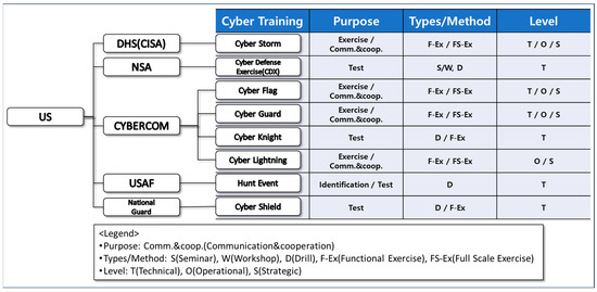 Globally, the United States has the most advanced and organized cyber capabilities. In addition, the United States publicly discloses information about its cyber training. This study will examine the most advanced and publicly disclosed U.S. cyber training and provide implications. The United States conducts cyber training at both the national and defense levels. The Department of Defense’s cyber missions and functions are divided into cyber operations and cybersecurity. The Cyber Mission Force (CMF) is responsible for cyberspace operations and is comprised of National Mission Teams/National Support Teams, Combat Mission Teams/Combat Support Teams, and Cyber Protection Teams. National Mission Teams/National Support Teams protect national security and interests, monitor adversary activities, and interdict and defeat cyberattacks. Combat Mission Teams/Combat Support Teams support the Unified Combatant Commands and conduct military cyber operations. Cyber Protection Teams protect and defend military networks and critical missions, respond to active threats, and conduct preventive and active defense missions [11,12].