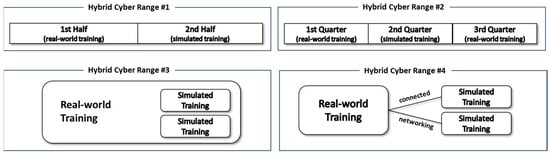 There are two ways to time a hybrid training regime: temporal integration and spatial integration, as shown in Figure 5. Temporal integration involves real-world training in the first half of the year and simulation in the second half of the year. In the first and second half of the year, training is conducted alternately in real-world training and simulation environments. Alternatively, real-world-based training can be conducted in the first and second halves of the program, with additional training in a simulated environment in the interim period. Spatial integration is the combination of real-world and simulation environments to form a training environment. Real-world equipment and simulated equipment can be organized in the same space. If there is a physical distance between the real system and the simulation equipment, they can be logically connected through a network to form the same training environment. In this way, simulated attacks can be carried out on the real system within a range that does not compromise services and data, and cyberattacks can be carried out in the connected simulation environment without any restrictions, providing the best of both worlds. By first penetrating the simulation equipment to secure a bridgehead and then attacking the real system serviced by the internal network, a realistic training environment can be organized.