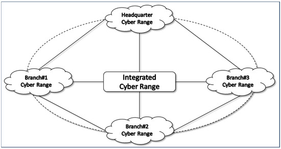 The operational concept of an integrated cyber range is to build and operate individual cyber ranges considering the cyber environment of the training headquarters and subordinate organizations (branches). An integrated cyber range means connecting distributed training centers through a network and utilizing them as a single training center. Through this, specialized services and resources of each cyber range can be shared, and there is a spatial advantage of participating in training from a distance. The methods and purposes of cyberspace utilization by the training headquarters and each subordinate organization are different. In general, the training headquarters conducts high-level cyber activities. Each subordinate organization utilizes various data in cyberspace to carry out detailed purposes and missions. To conduct effective cyber activities, it is necessary to build cyber ranges individually to reflect the characteristics of each organization’s cyberspace, as shown in Figure 6, and the training headquarters should conduct integrated cyber training by interconnecting subordinate organizations to achieve high-level goals.
