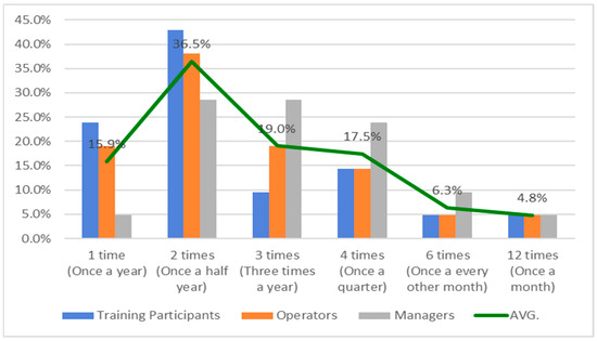 To design effective cyber training, a survey was conducted to determine the frequency and type of training by each user. The survey conducted in this study was conducted to derive effective cyber training implementation methods and flexible cyber range composition methods. The survey was conducted on participants who actually participated in cyber training and operators who operate and manage cyber ranges. (However, since the participants in the survey belonged to the Ministry of National Defense of South Korea, their security policy restricts the disclosure of their detailed affiliations and survey results.) In the survey, users were divided into three groups: the “Training Participants”, who participate in training and perform cyberattack and defense missions; the “Operator”, who builds, organizes, and operates the cyber range; and the “Manager” who designs and manages cyber training policies and provides feedback on training results. According to the survey results, the preferred frequency of cyber training for each user is shown in Figure 8. In terms of the number of cyber training sessions, users felt burdened by exceeding four training sessions per year and preferred to conduct training at regular intervals. In addition, it was recognized that the training effect would be low if it were performed once a year, and the burden of preparing for training would increase if it were performed 12 times.