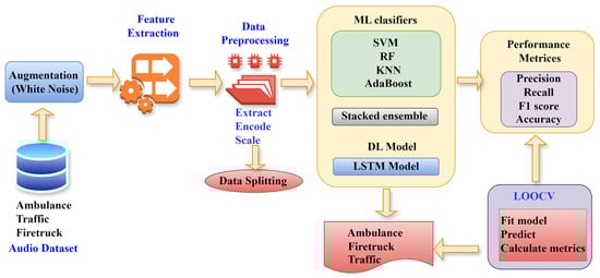 The proposed methodology of the emergency vehicle siren classification system using ML is shown in Figure 1. The ML classifier models of SVM, RF, KNN, AdaBoost, a stacked ensemble method, and the DL LSTM model are employed to categorize the audio samples accurately. These models predict the class of each audio sample, distinguishing between ambulance sirens, firetruck sirens, and traffic noise. The system’s performance is evaluated using performance metrics, which ensure the model’s accuracy. The first step in the audio signal classification is to pre-process the audio data by analyzing the sampling frequency contents, and duration of the audio, and implementing the data augmentation techniques, incorporating varying sound qualities to replicate real-world conditions. In the next phase, during feature extraction, these audio signals are converted into measurable characteristics, such as spectrograms, capturing essential information within the audio. Then, the data will be standardized and split into training and testing sets for practical model training. The implementation of the model from the detailed description of the dataset to the final classification is discussed in the following subsections.