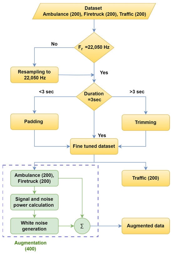 The raw audio dataset containing 600 audio samples comprises the classification of ambulance, traffic, and fire trucks and is taken from the Kaggle []. Among 600 samples, each classification samples consist of 200 samples. The available samples are segmented into a maximum 3 s duration with a sampling rate that varied between 11,025 Hz and 24,000 Hz and a resolution of 16 bits/sample. This dataset serves as the foundation for the classification task, providing the necessary input for feature extraction and model training. Although the controlled nature of the samples may introduce potential biases, such as a lack of real-world background noise, data augmentation techniques, like adding noise and simulating the Doppler effect, were applied to enhance the dataset’s realism and improve model generalization to real-world environments.