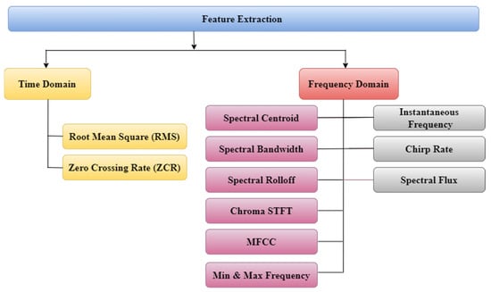 In the process of extracting features from both the original and augmented data, a variety of features are evaluated in terms of both the time domain and frequency domain. The time domain features include root mean square (RMS) and zero-crossing rate (ZCR), which provide valuable insights into the signal’s amplitude over time, capturing variations and patterns essential for differentiating between various sound types. These features are effective in distinguishing sirens from background noise, as emergency vehicle sounds exhibit distinctive temporal patterns. In contrast, the frequency domain features encompass spectral centroid, spectral bandwidth (SBW), spectral roll-off, chroma short-time Fourier transform (STFT), Mel-frequency cepstral coefficients (MFCCs), minimum and maximum (Min and Max) frequency, instantaneous frequency (IF), spectral flux, and chirp rate. These frequency domain features facilitate the analysis of frequency content, spectral changes, and frequency modulation in audio signals. MFCCs, in particular, are widely used for their ability to mimic human sound perception, making them effective for differentiating siren types. This categorization of feature extraction methods into time domain and frequency domain is illustrated in Figure 3. By employing this dual approach, the intricacies of emergency vehicle sounds are accurately captured, thereby enhancing classification accuracy. The following subsections discuss the detailed analysis of both the time domain and frequency domain features, emphasizing their crucial role in the identification and classification of emergency vehicle sounds. Although features such as IF, chirp rate, and spectral flux belong to the frequency domain, they are discussed separately.