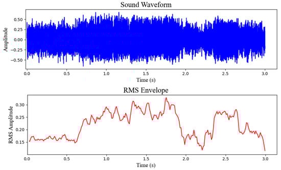 Here, RMSi represents the RMS value for the ith frame of the audio signal. The subscript i indicates that the RMS value is calculated for a specific frame ii within a sequence of overlapping frames into which the audio signal has been divided. The term xwi(t) denotes the windowed signal for the ith frame, where xi(t) is the original signal of the ith frame and w(t) is the window function applied to the frame. The parameter N represents the number of samples in each frame, and t is the index of the sample within the frame, ranging from 0 to N−1. Figure 4 shows the amplitude variation and the corresponding RMS envelope of input of the audio sample.