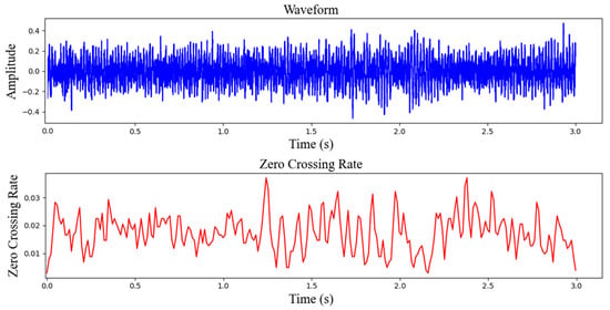 where xn is the amplitude value of the audio signal, N is the total number of samples, and sign(x) is the sign function that returns [−1, 0, 1] depending on the x sign. The visual representation of the variations in the amplitude of the audio signal over time and how the ZCR varies over time in response to the amplitude changes in the siren signal is shown in Figure 5.