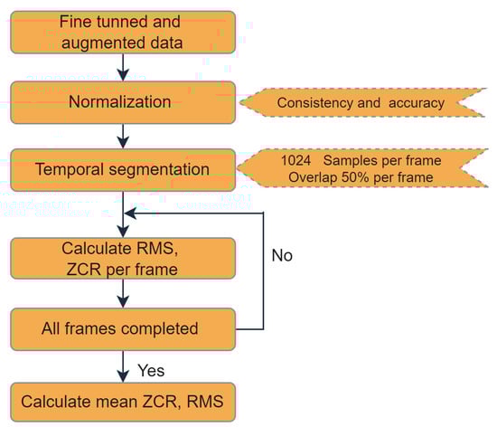 To facilitate dynamic extraction of the RMS and ZCR features, various siren signals are employed from the fine-tuned and augmented dataset. The extraction procedure is shown in Figure 6. The computation of the RMS value begins with the proper normalization of the audio signal, which is then divided into 1024 samples with a 50% overlapping frame size. This process is consistently applied across all frames throughout the entire audio signal, resulting in a time series of RMS values that reflect the variations in signal energy over time. For each frame, the square root of the mean of the squared amplitude values of the signal is calculated to determine the RMS value for that specific frame. In a similar manner, the extraction of the ZCR involves dividing the audio signal into the same overlapping frames used for the RMS calculation. After computing the ZCR for each frame, the mean ZCR across all frames provides a comprehensive measure of the signal’s noisiness over time. While calculating RMS and ZCR, the number of frames and overlapping frame size are chosen to provide a balance between the temporal resolution and frequency resolution. A detailed flowchart diagram illustrating this methodology is presented in Figure 6. For a given 3 s audio signal, this process produces about 257 frames, which is a manageable quantity for real-time processing while mitigating the computational overhead associated with increased overlap or larger windows.