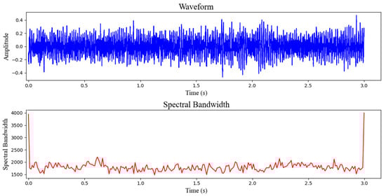The interpretation of the spectral bandwidth (SBW) of a wave is illustrated in Figure 8, which corresponds to the same sample presented in Figure 7. Analyzing both figures reveals that the bandwidth is narrow, indicating that most of the signal energy is concentrated near the spectral centroid. Consequently, this results in the sound being perceived as pure with fewer harmonic components.
