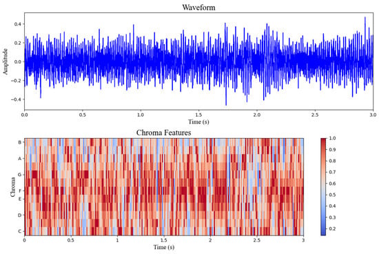 Chroma STFT: Chroma features represent the energy distribution of musical notes across different pitch classes and provide information about the harmonic content of the audio signal. While initially designed for music analysis, chroma features can still offer insights into the tonal characteristics of emergency vehicle sirens, which may have distinct harmonic structures, as shown in Figure 10. The chroma waveform displays the amplitude variations of the signal over a three-second interval, emphasizing the dynamic changes in loudness. In contrast, the chroma feature plot below analyzes the harmonic content of the audio by mapping the intensity of pitch classes (C to B) over the same period. This chromatogram illustrates the presence of pitches and how their strengths fluctuate over time.