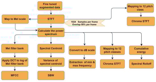 The process begins with the pre-processed audio signal, which refers to fine-tuned augmented data. From these data, the extraction process is performed by applying the STFT to the time domain signal to convert it into the time frequency domain. This transformation is achieved by dividing the audio signal into overlapping frames with a frame length of 1024 samples and 50% overlap per frame and applying Fourier transform to each frame. The result is a complex-valued matrix that represents the signal’s frequency content over time. Once the STFT is computed, the next step involves calculating the power spectrum of the signal. This is performed by squaring the magnitude of the STFT coefficients, resulting in a matrix that reflects the power distribution across frequencies and time. From this, most of the key features are extracted for accurately predicting and classifying different types of audio signals.