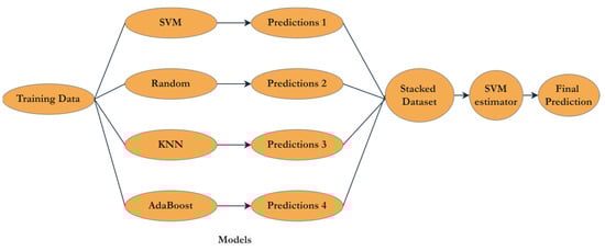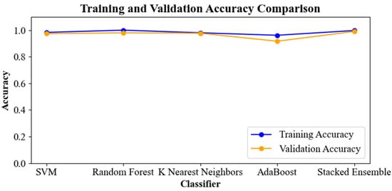 Training accuracy assesses how well a model fits the training data, while validation accuracy evaluates its ability to generalize to new data, which is a critical indicator of a model’s performance and reliability. Table 7 presents the training and validation accuracies of SVM, RF, KNN, AdaBoost, and stacked ensemble classifiers. The training accuracy represents how well each classifier performs on the training data, while the validation accuracy indicates its performance on unseen validation data, providing insights into its generalization ability.