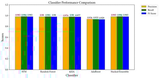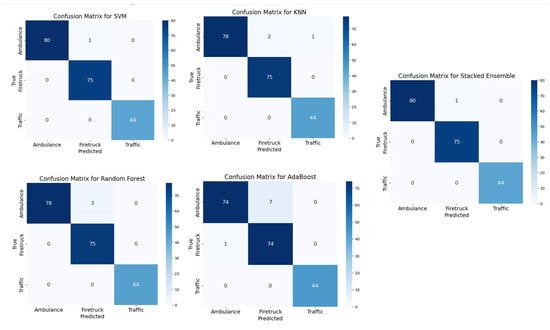 Further, to address a detailed analysis of the types of errors made by the models, the confusion matrices, precision, recall, and F1 scores for each class are examined. This analysis helps identify specific areas of weakness and provides insights into how the models can be improved. The confusion matrices of the models are given in Figure 16. Based on the results, the SVM model and stacked ensemble demonstrated excellent performance, achieving an accuracy of 99.5% with only one misclassified example. The confusion matrix reveals that this misclassification occurred in the ambulance class, where one instance was predicted as a firetruck. No errors were observed in classifying firetrucks or traffic. According to the confusion matrix, the KNN and RF models performed slightly less accurately than the SVM with three misclassified examples, whereas the AdaBoost model had the lowest accuracy with eight misclassified examples, making it the weakest performer among the models. The confusion matrix shows that the majority of errors occurred with the ambulance, where seven instances were misclassified as a firetruck, and one firetruck was misclassified as an ambulance.