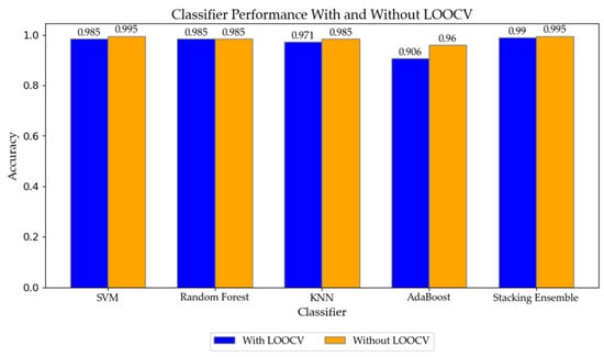A comparative accuracy of various ML models was performed, evaluating their basic accuracy alongside the accuracy achieved through LOOCV. The SVM model demonstrates consistent performance, with both basic and LOOCV accuracies recorded at 0.985 and 0.995. This indicates a well-generalized model that performs reliably with unseen data. Similarly, the RF model shows the same accuracy from basic to LOOCV accuracy. This suggests that there is no tendency towards overfitting, underscoring its robustness in generalization. The KNN model, which reveals a basic accuracy of 0.985 and a nearly equivalent LOOCV accuracy of 0.971, illustrates underfitting, though it continues to exhibit strong overall performance. In contrast, the AdaBoost model experiences a significant performance decline, dropping from a basic accuracy of 0.966 to a LOOCV accuracy of 0.906. This substantial decrease indicates that AdaBoost may be overfitting to the training data, resulting in diminished effectiveness when evaluated with new data.