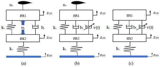Simplified models of the 2-DOF quarter of the vehicle: (a) ASS with an active airfoil [25], (b) SASS with an active airfoil, (c) SASS only [26].
