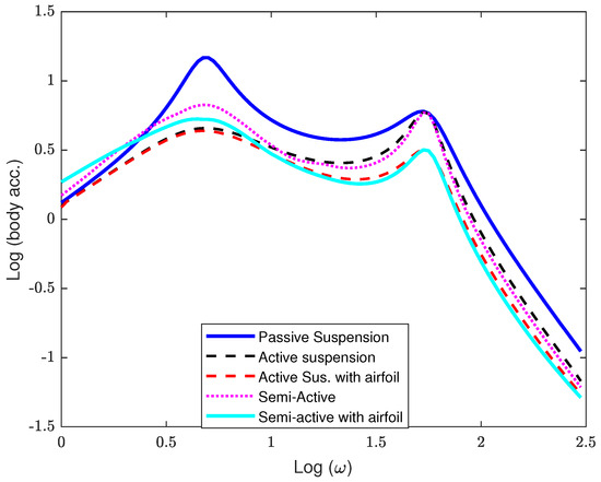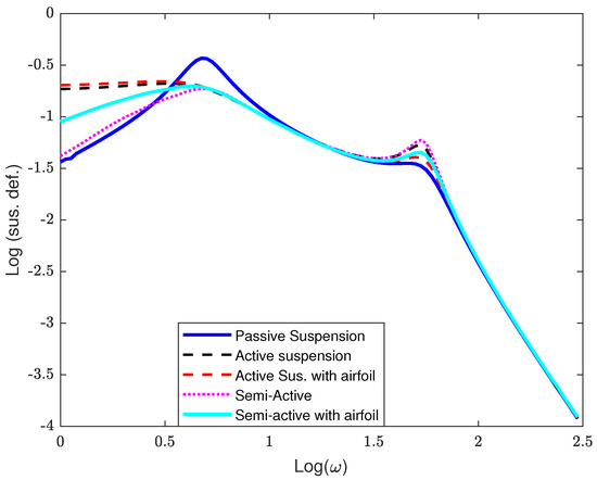 However, for input road velocity excitation signal , the frequency response for the nonlinear model can be calculated by determining the amplitude ratio (amplitude transmissibility) of the input and output signals [44]. Amplitude transmissibility is key in studying vibrational systems, including vehicle suspension systems. It refers to the ratio of the output’s amplitude to the input’s amplitude when reaching steady-state condition [45]. Only the first weighting set with , and was considered for the frequency response calculation. Figure 3, Figure 4 and Figure 5 show the dynamic frequency response of the sprung mass acceleration, suspension travel, and suspension deflection of the quarter-car model in the presence of the AAS. The results showed that the downward active airfoil force on the vehicle chassis, in combination with the control force from the SASS, achieved the best compromise between an ASS with an airfoil and one without it.