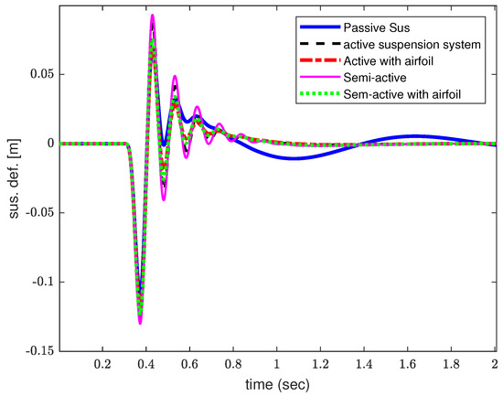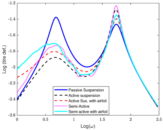 Figure 3 shows the invariant resonant peak point remained unchanged regardless of the control law applied. The two resonant peaks in the frequency response, highlighting the metric of passenger comfort, could be improved by modifying the damping constant parameters. However, this enhancement in the first hop resonant frequency would be achieved at the expense of frequency harshness (slow roll-off) at high frequency. From the mode shapes, it is evident that the sprung mass primarily characterized the low-frequency mode shape of the first resonant peak frequency. The vehicle’s unsprung mass mode (tire hop) represents the high resonant peak. The benchmark case of an ASS equipped with an active airfoil dampened the instantaneous deviation in the first hop and at the same time, enhanced road holding. However, in the case of a SASS supplemented by an active airfoil, the response showed that the tire hop frequency was significantly reduced compared to the PASS, ASS, and SASS. However, the low-frequency amplitude response remained considerably lower than that of the passive and SASS near the first hop frequency.