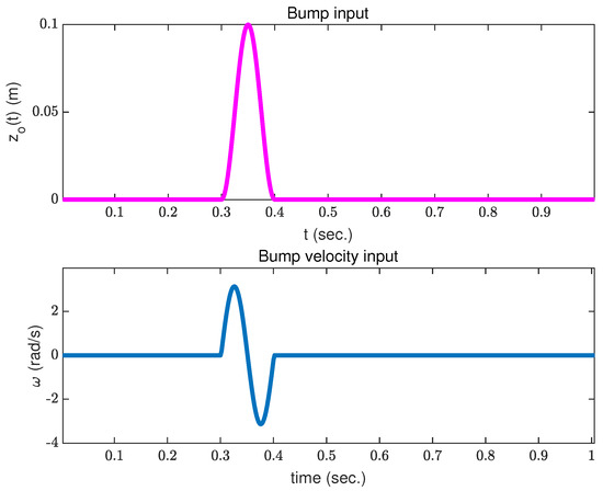 External road disturbance impacts the car and its suspension system. Different types of deterministic and stochastic road disturbances are applied to the vehicle to evaluate the performance of the synthesized model. Road bump refers to the disturbance experienced by a car when it passes through a raised or depressed section of the road surface in the form of speed bumps or potholes. Applying the bump as input disturbance can significantly affect the vehicle’s dynamics. Equations (6) and (7) depict a bump position input and its corresponding velocity vector [31].