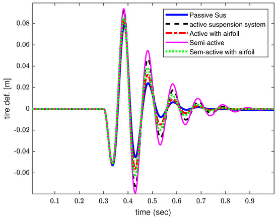 The suspension stroke is kept within a specific limit to protect the vehicle suspension system from any structural damage, as there is limited space under the hood [46]. Figure 4 illustrates the response at low frequency near the sprung mass’s resonant hop frequency significantly reduced rattle space requirements compared to the ASS with and without considering the AAS. However, the response remained within acceptable bounds near the tire hop frequency and performed better than the ASS and semi-active suspension system. From Figure 5, the response from the dynamic tire deflection, which quantifies the road holding capability, stayed lower than the passive suspension system at the car body’s resonant frequency. At the same time, a mixed response was achieved at the tire hop resonant frequency and remained better than that of active and semi-active suspension systems. It can be concluded from the overall response that the proposed model effectively isolated the car body from external road disturbances and improved the target parameters, thereby enhancing ride quality and handling ability compared to other suspension systems.