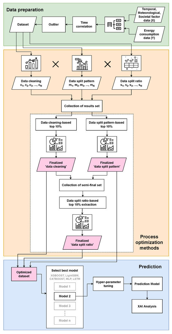 This section provides an overview of the proposed architecture for energy prediction, focusing on time series data processing. As depicted in Figure 1, the architecture comprises three main stages: data preparation, process optimization methods, and prediction. The data preparation phase collects data based on objectives and synchronizes the collected data in time. In the process optimization methods stage, data are optimized based on three conditions that consider the patterns and characteristics of time series. These conditions include normalization, data cleaning, data split patterns, and data split ratio to enhance model performance, reduce training time, and mitigate the impact of outliers. Min–max normalization is applied to address the varying range of feature values, ensuring consistent data scaling. Additionally, eight data cleaning methods are considered to resolve issues such as missing values and duplication. The data split patterns are designed to reflect seasonal and quarterly trends inherent in time series data, while the data split ratios are set to capture the overall trends over time, ensuring a robust and accurate model. Subsequently, the optimized data are used to compare and analyze the performance of prediction models.