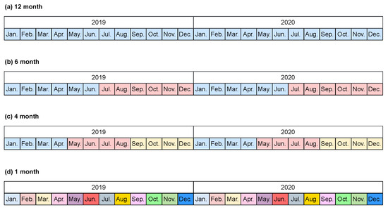 An example of data split patterns: (a) Division into 12 months: a single model. (b) Division into 6 months: two models. (c) Division into 4 months: three models. (d) Division into 1 month: twelve models.
