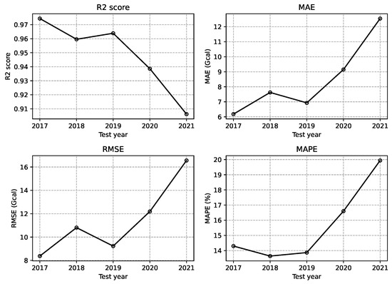 The third consideration is the data split ratio. In this study, training and test data were divided into one-year increments for annual energy prediction. The reason for aiming at annual predictions is to assess whether the model can effectively predict changes and capture the overall trends in the flow of time series data. While this provides a comprehensive overview of seasonal variations, predicting beyond one year becomes less reliable due to recent extreme weather events and the shortening of seasonal cycles. These factors introduce significant variability, making predictions over longer periods, such as three or ten years, less efficient and more prone to inaccuracies. Figure 4 illustrates how the performance of the model trained on the heat energy dataset from 2012 to 2016 changed over time. To evaluate performance, the R-squared score (R2 score), mean absolute error (MAE), root mean square error (RMSE), and mean absolute percentage error (MAPE) were used. Detailed information about these metrics can be found in Section 3.3. The figure shows a consistently decreasing trend in all performance metrics, except for 2019. Additionally, it confirms that the performance after 2 years does not exceed the performance immediately after training.