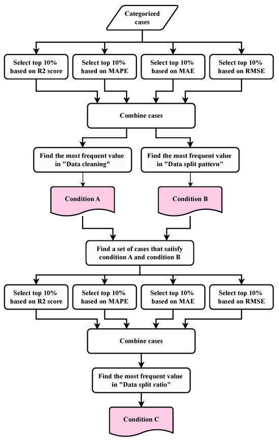 Figure 5 illustrates the methodology for identifying the optimal conditions. Initially, the three conditions, “Data cleaning”, “Data split pattern”, and “Data split ratio”, are combined to create “Categorized cases”. The results of the “Categorized cases” are then sorted by highest performance for each metric and combined by selecting the top 10%. In this case, “Combined cases” represent 40% of the total data and may include duplicate values. In the “Combined cases”, the condition value with the highest percentage for the condition of interest is identified and selected. In this process, the values for “Data cleaning” and “Data split pattern” are determined, and for the results where these values are used, each metric is sorted in order of highest performance, the top 10% are selected, and they are combined. Additionally, the cases where the “data split ratio” is used the most are identified. Using the selected conditions, a final dataset for model training is prepared. This process allows for the identification of the most appropriate conditions for optimizing the dataset, which can subsequently be used to train the final model.