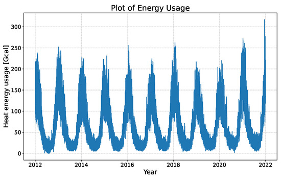 Heat supply data, used to predict actual heat energy consumption, were collected hourly from an eco-friendly liquefied natural gas combined heat and power plant in Cheongju, Republic of Korea. The data are collected on an hourly basis from 2012 to 2021, comprising a total of 87,672 data points. Heat supply refers to the amount of heat delivered from the power plant to consumers, and the unit is gigacalories (Gcal). It covers heat consumption for space heating and domestic hot water usage. Figure 6 visualizes the profile of the heat energy usage, showing a recurring pattern with a one-year cycle, reflecting its seasonal characteristics.