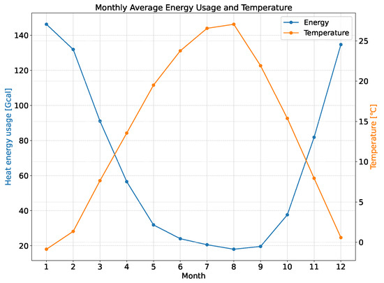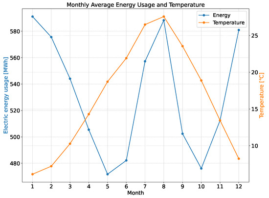 To understand the periodicity of energy usage and its correlation with the outdoor temperature, one of the key variables, the monthly average energy usage and monthly average temperature are visualized in Figure 7. The x-axis represents the months, and the y-axis represents the monthly average energy usage and the monthly average temperature. The monthly average energy and temperature are computed by summing respective values across different years for each month and dividing by the corresponding number of data points. This visualization reveals that energy usage is high in the low-temperature period and low in the high-temperature period, indicating a seasonal pattern in energy consumption.
