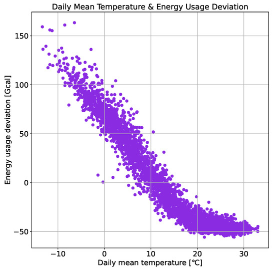 Daily mean temperature and heat energy usage deviation.