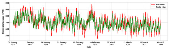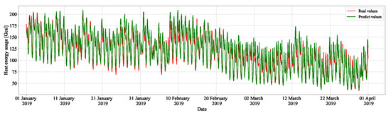 Figure 9 shows the prediction results of LightGBM on the test data. The green solid line represents the predicted values, while the red solid line denotes the real values. The x-axis and y-axis represent the dates of test data and the heat energy usage [Gcal], respectively.